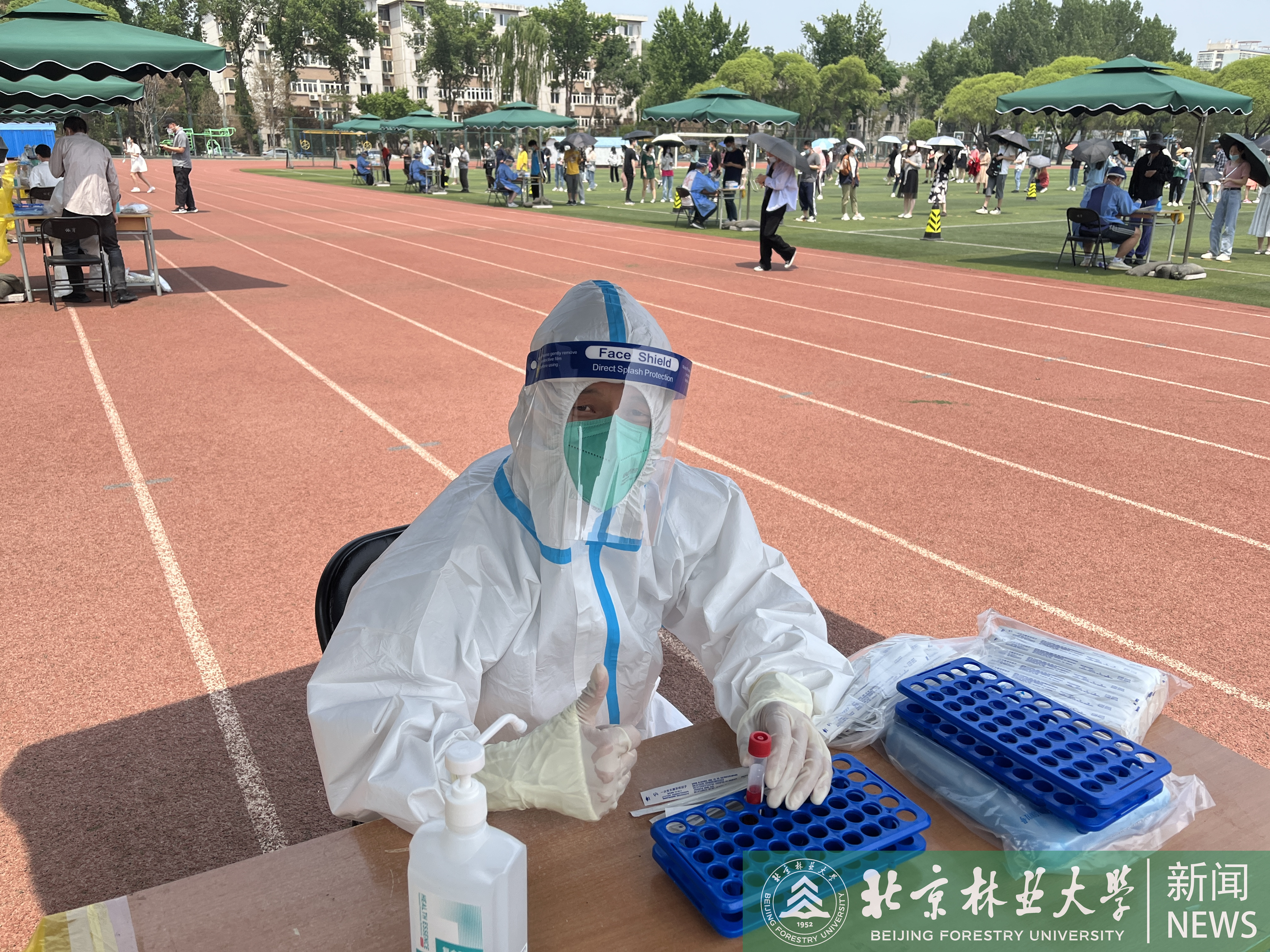 校医院王士庆大夫至今已有近30年的工龄。在收到加强防疫管理通知时,他刚完成当天核酸采样的工作,还没脱下防护服,带着手套就发信息报名,主动请战、进校值守。在防疫管理期间,他主要负责医疗物资采购及核酸采样。在近期逼近35度的高温下,他身穿防护服,戴着N95口罩,配上面罩、手套、鞋套,“全副武装”坚持数个小时,脸上、手上的浮肿都是常态。他说到“这算啥?和在病区的医生相比,我们这都是小儿科。”他平时喜欢踢足球,但疫情期间已经很久没踢了,他只能用换班的间歇活动活动腿脚,他看着操场井然有序的核酸队伍,期待着抗疫胜利的到来。