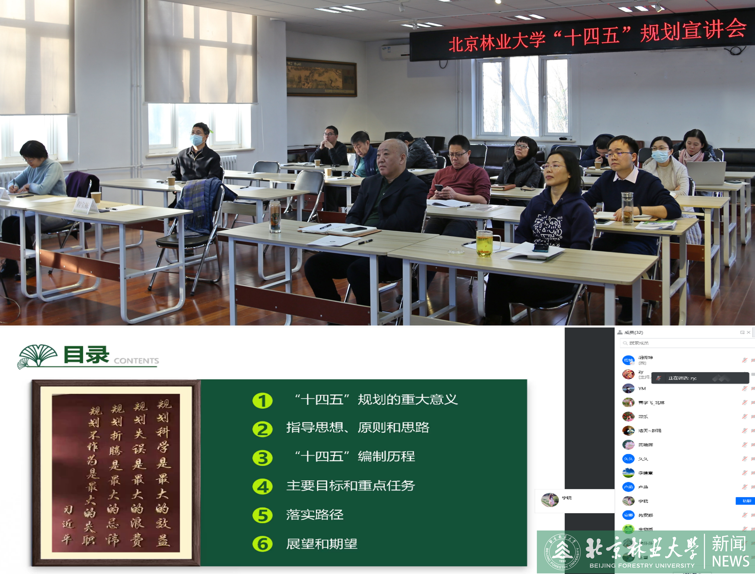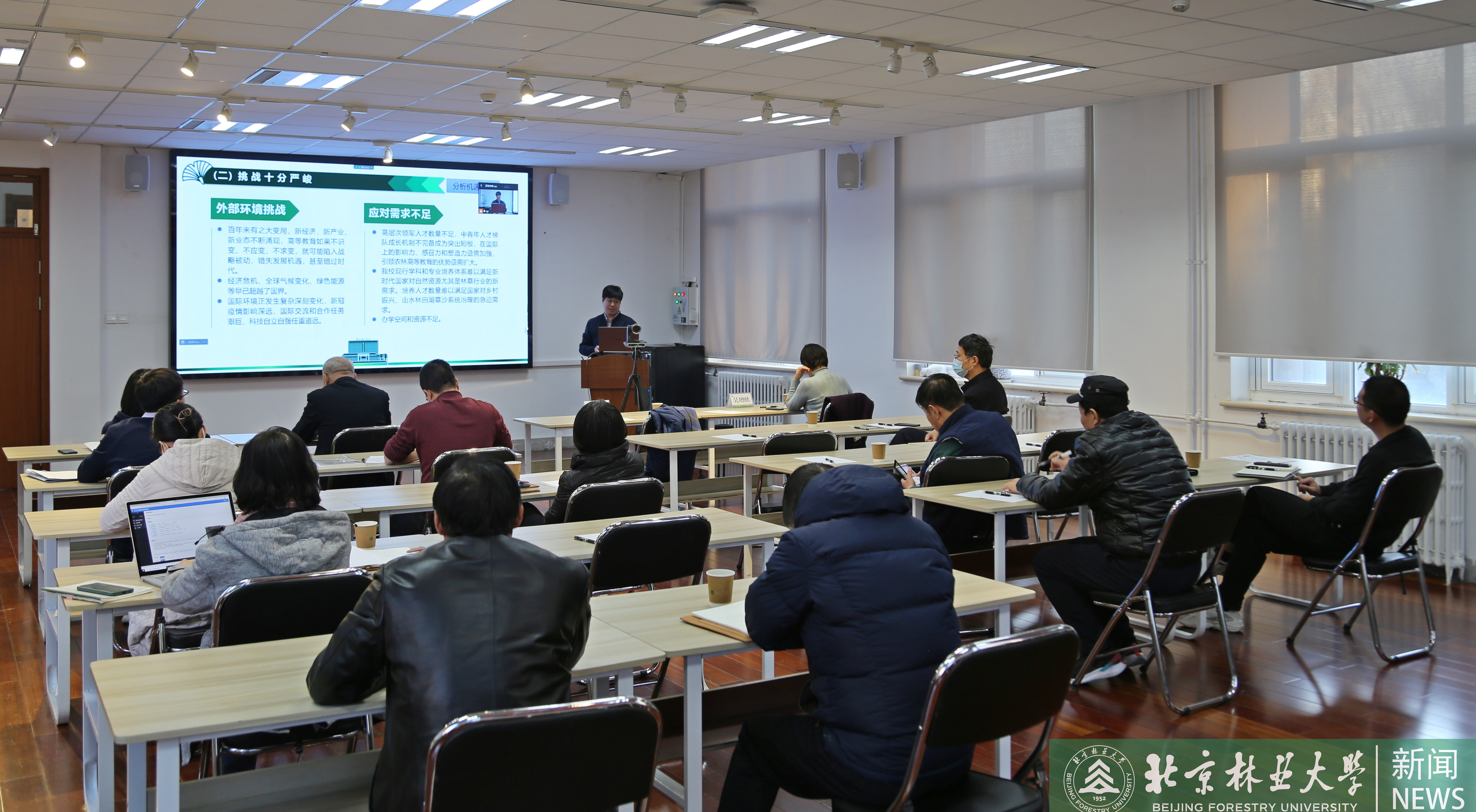 宣贯工作组成员以“开拓创新、乘势而上,建设扎根中国大地的世界一流林业大学”为主题,系统讲述了学校事业发展“十四五”规划的重大意义、指导思想及原则思路、编制历程、主要目标和重点任务、落实路径、展望和期望等六个方面内容。学校“十四五”规划在总结“十三五”总体建设成效的基础上,凝练“1+11+18+8+N”规划体系,确定了“十四五”时期学校奋斗目标、关键指标、重点任务与举措以及实施保障,为实现建设扎根中国大地的世界一流林业大学的目标奠定坚实基础。