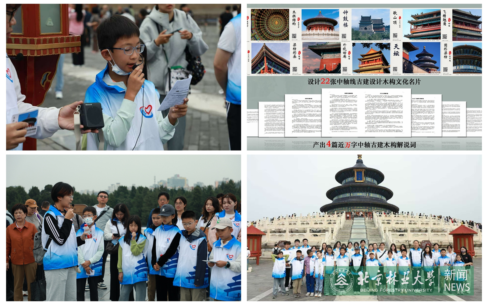 “木述古建”薪火相传,携手中轴居民共做古建木构与生态智慧“传承者”。聚焦北京中轴线文化保护与生态理念传承,党支部党员骨干联合专业教师勘察永定门、天坛、钟鼓楼等古建,挖掘古建木构“天然取材、与自然共生”的文化内涵,完成22张古建文化名片设计及4万余字讲解词;联合天坛街道办党支部组织50余名社区青少年组建“小青团讲解队”,在天坛公园常态化开展志愿讲解,让藏在砖瓦木梁间的生态智慧“活起来”,实现中轴线木文化与生态文明理念可看、可学、可传播。