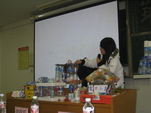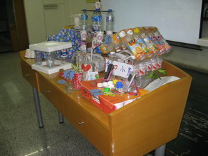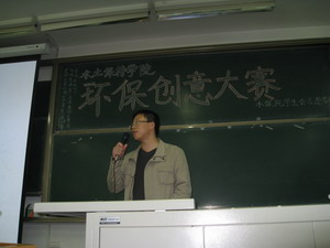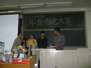 比赛共分为三个环节,第一环节是关于环保知识的必答题,各个代表队都有不俗表现。第二环节的选答题极大的挑战了各队的勇气及知识储备。而最后一个环节的废品设计则是将比赛推向了高潮。短短的20分钟,各个队伍凭借活跃的思维与超强的动手能力,将一堆堆废弃塑料等设计成了一件件精致美观而实用的艺术品。最终,环规08-2班勇夺桂冠,水保08-3班、土木08-1班分列二、三名。