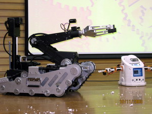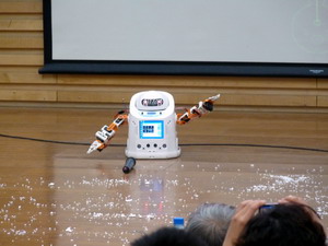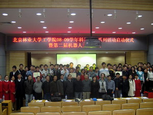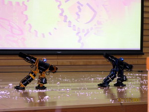 活动第二项为工学院第二届机器人大赛决赛。共有九支队伍分三组进行比赛,每场比赛由两个机器人同场比赛,在规定的时间内将球收入机器中并投入固定的小孔中。九个机器人各有特色,有灵活、迅速的“双核奇兵”,以迅雷不及掩耳之势抢到了小球,投入洞内之后主动去干扰对手,有霸道的“猎鹰”投完球后占住洞口不让对手投球,有“神奇”的“NOVA”以沉着、稳重赢得满场喝彩,有笑星“万里阳光号I”给观众带来无穷乐趣……。这不是一场机器人之战,而是有智慧的小人在激烈的比拼在场观众经常不由自主地站起来,鼓掌喝彩。最终由机器人“双核奇兵”获得一等奖,“动车”、“NOVA”获得二等奖,“万里阳光号I”、“蜗牛”、“猎鹰”、获得三等奖由“无畏者”获得最佳创意奖,其他几个机器人捧得了优秀奖。
