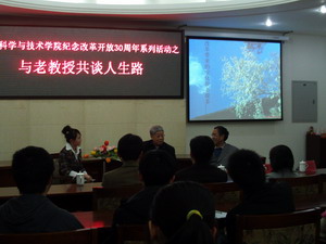 此外,田砚亭教授还用生动的例子给大家讲述了改革开放三十年来农村的变化,作为村官助理团团长的他,还就村官在新农村建设以来发挥的作用给大家作了介绍。从访谈中,在场的同学们能感受到两位老教授对他们的事业,对林业大学深深的热爱和为了自己的理想永不放弃的精神。