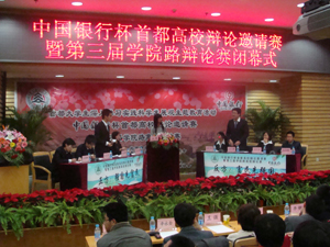 日前,经过一个月的赛程,中国银行杯首都高校辩论赛暨第三届学院路高校辩论赛闭幕式在我校图书馆五层报告厅举行,市学联、校团委、中国银行等相关单位负责人出席了会议,学院路八大高校的代表也参加了会议。