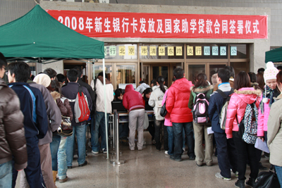 日前,我校2008级新生中国银行卡发放暨国家助学贷款合同签署在主楼二层平台举行。615名新申请国家助学贷款的学生在此与中国银行清华东路支行的工作人员面签了助学贷款合同,另有1900余名已贷款学生将签署今年的放款借据。与往年不同的是,4300余名08级新生每人也在现场领到了一张中国银行借记卡。大学期间他们可通过此卡方便的缴纳学费、领取助学金和生活补助。