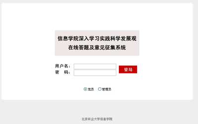 据介绍,系统题库中现有学习题目超过600个,选自《毛泽东、邓小平、江泽民论科学发展》、《科学发展观重要论述摘要》、《北京林业大学深入学习实践科学发展观活动学习材料汇编》等学习实践活动辅导教材。学院每名党员均有独立的用户名和密码,系统为登录者随机抽取50道题目形成答卷,答题完毕后给出成绩。学院党委有关负责人指出,进入学习实践调研阶段后,学院学习实践活动领导小组按照本阶段的相关安排,将组织全院党员实名登陆在线系统,进行网上答题,检验广大党员学习调研阶段的学习效果。