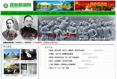 今日,绿色新闻网正式推出“五四”运动90周年纪念专题,http://news.bjfu.edu.cn/ztbd/bxdjs--wsyd90znjn/。欢迎广大师生点击浏览,并积极参与投稿,提供有价值的资料和视点新闻。相关信息请发至tongxunshe323@163.com