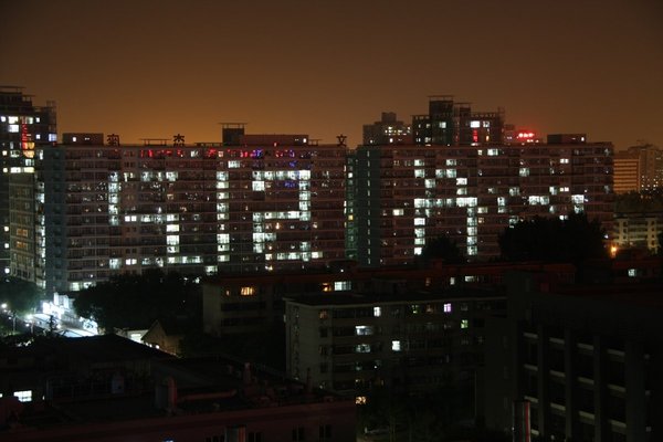 5月12日晚十点,北京林业大学同学们响应学校红十字会的倡议,在宿舍中用熄灯亮灯的方式摆出了烛火、四川、“512”等图案,对正在重建的四川灾区送上自己的祝福。
