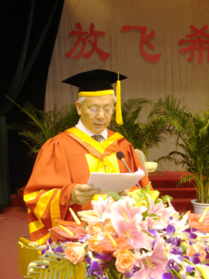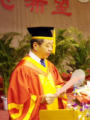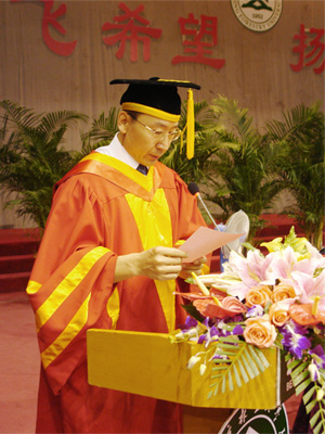 校长尹伟伦院士讲话,希望毕业生能够在新的工作岗位上能更好更快地发展,并提出三点希望。首先要坚定信念按,奉献社会。虽然当前经济危机使毕业生在择业中遇到了许多困难,但困难是暂时的,危机下蕴含着新的机遇和挑战,要保持信心,在品德、学识、事业、婚姻、家庭等各个方面都交上一份满意的人生答卷。其次要勇于创新,学以致恒。今天毕业并不是学习过程的结束,而是一个新的学习阶段的开始。要保持崇尚科学的志趣,不断追求真理、勇于创新,在各自的领域开创出新的天地。最后要内外兼修,完善自我。将“为学”与“为人”结合起来,恪守“君子不可不修身”的古训,做一个全面发展的人、一个对社会有贡献的人。祝福所有毕业生在今后的人生道路上不断进步,身体健康,家庭幸福,创造辉煌。