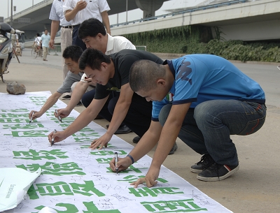 早上7:30,队员们便开始在活动场地准备,尽管南京的天气从早晨开始就很闷热,但队员们不顾艰辛,热情很高,很快投入到了工作中。活动中,绿色长征队员们向来往的市民宣传绿色长征,提倡节能减排,收集市民们生活中的节能环保金点子和能源利用案例,并向市民发放美国新一代研究院与利丰集团赞助的新型可降解的环保购物袋,让市民在以后的生活中更加注意减少使用不可降解的塑料袋,多使用环保袋。通过发放节能环保小册子和横幅签名活动,提高了市民节能环保的意识,也让市民意识到力行节能环保是每个市民的责任。绿色长征志愿者们通过讲解有关节能环保的知识,将可持续发展的绿色环保理念深入到了南京市民心中,共同倡导绿色节能的生活新方式。