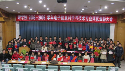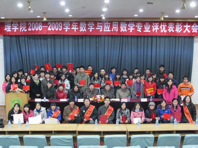 12月13日,北京林业大学理学院2008-2009学年评优表彰大会在东配楼大报告厅隆重举行。为扩大本次评优表彰大会的影响,也为了更有针对性的对获奖同学进行表彰,理学院院特意在下午和晚上分别为数学和电子两个专业的同学召开表彰大会。学院党政领导、班主任老师、辅导员以及各专业全体学生参加了本次大会,会议由学院党委副书记主持。