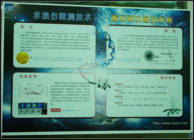 “非损伤微测系统”是具有世界先进水平的多学科尖端科技的系统集成, 是当今微电子、计算机、精密机械加工、物理、数学、高分子化学、碳纳米及光学显微技术等多学科优秀成果的结晶。非损伤微测技术已经应用于生命科学研究的许多重要领域,如动物和植物的生理调控、生长发育、逆境生理、重要疾病发生发展机制等。“非损伤微测系统”:是由非损伤微测四维运动控制系统、非损伤微测信号采集系统及非损伤微测软件组成。这个系统是在电脑自动控制下,利用特异性离子电极,在不接触被测样品的情况下获得进出样品的各种分子/离子的浓度、流速及其运动方向的信息。它不仅可以测得单个分子/离子的温度及pH值等参数,而且还可利用多电极同时采集多种分子/离子及其参数的活动信息。被测样品可以是单个细胞,也可以是组织或器官。测量不仅方便、快捷、多维和实时,而且对被测对象不产生任何损害。