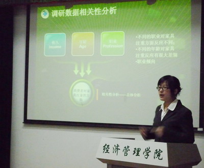 答辩会上,15个团队的参赛同学分别从调查目的、调查方法、调查形式、数据分析、结论和建议等方面对各自团队的作品进行了精彩的陈述展示,并接受评委的现场提问。评委老师认真阅读了参赛团队的市场调查分析报告,听取了各团队的现场陈述,从调查的视角、调查方法的科学性、数据的甄别和分析、调查结论的准确性等多个方面进行了专业而深入的点评。经过激烈角逐,《考研培训市场调查报告》作品团队摘得头筹,《北京市海淀区大学生理财状况调查报告》和《北京市家具市场消费需求调研与分析》作品团队分列第二名和第三名。
