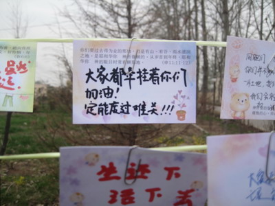 21日中午,在大兴军训基地食堂与宿舍的交接处,聚集了很多学生,原来大家驻足停留是为了给玉树灾区人民祈福,他们认真的把自己想对灾区同胞想说的话写在便签纸上,并慎重的挂起来,希望通过这种方式可以表达他们心中对灾区人民的牵挂与祝福。