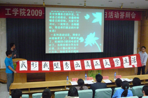 五四青年节期间,工学院团委举办了2010年团日活动总结答辩会,34个基层班级团支部参加团日活动评比,最终有12个班级团支部进入决赛答辩环节。