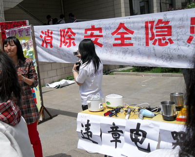 路过的同学们也都积极参加到活动中,在违章电器展台前询问尚不清楚的违章电器的危害,在主题宣传横幅上签下自己的名字,在主题展板上留下自己的承诺。纷纷表示会从我做起,严于律己,拒绝违章电器,共创宿舍的安全文明。