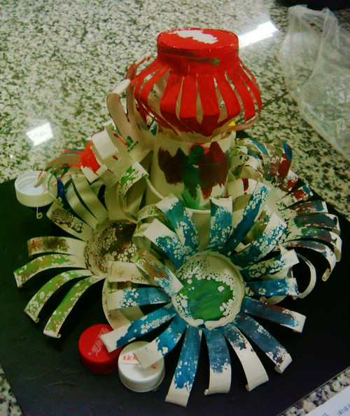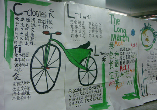 自制的环保模型均由废旧材料组成,制作精致且富有内涵,“垃圾废料只不过是一种放错地方的资源”,借此表达低碳节能的理念。除使用废旧材料外,初级班学员对概念购物袋的形状、造型加以创新。同时,展览以图文的形式将之前的主题活动环节的精彩瞬间呈现出来,无论是大兴军训基地的签名横幅,还是学员自制的低碳书签的过程和校园内低碳生活宣传活动,都给初级班学员留下了深刻的记忆,同时也将低碳生活以多样精彩的形式展示出来。值得关注的是,此次展览所使用的手绘海报于展览结束后被制作成简易购物袋,将低碳的理念融于今后的日常生活中。