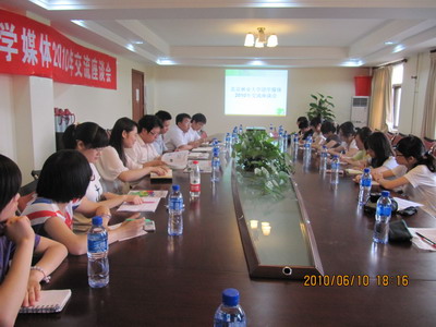 6月10日下午,北京林业大学团学媒体2010年交流座谈会在我校大学生活动中心举行,校团委书记负责老师,中国青年报记者、全国高校传媒联盟秘书处理事唐轶,与校团学媒体全体成员一起参加了本次座谈会。