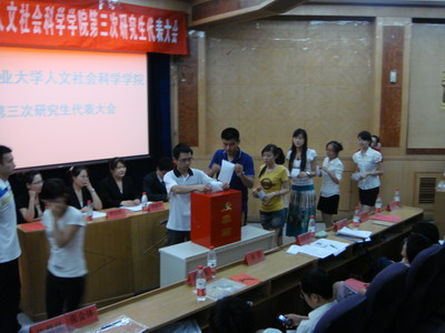 2010年6月13日,人文社会科学学院第三次研究生代表大会在东配楼小报告厅隆重召开。人文学院相关负责老师以及人文学院的64名研究生代表参加了本次大会。