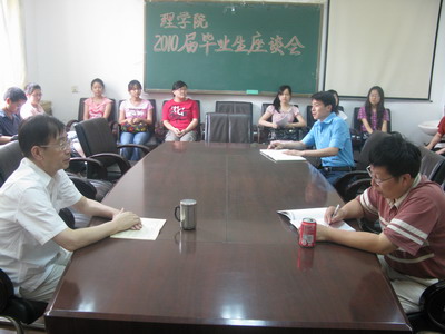 日前,理学院在基础楼221召开2010届毕业生座谈会,每个毕业班级选派6名毕业生代表参加了本次座谈会,学院院长和有关学科负责人教授参加了本次会议。