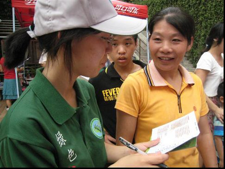 7月11日下午,在绿色长征黄金海岸团开幕式后,北京林业大学、华南农业大学、富群环境研究院、广东太古可口可乐公司的黄金海岸团志愿者们在广州市天河五所社区广场开展了绿色咨询活动。社区居民积极参与其中,志愿者们为居民们普及低碳知识和低碳生活方式。