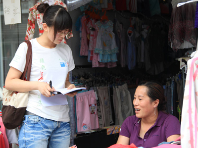 在每天的日程安排中,都少不了入户调查这一项。同学们完成当天的实地测量后,就会来到当地农民家中,对磨盘柿的种植和销售情况进行详细询问,村民们也很乐意参加调查活动,很多村民闻讯后都前来咨询或反映问题。对于村里普遍存在的一些种植技术问题,同学们对村民进行了针对性的培训。除此之外,实践队员还到当地集市上对商户、游客进行访谈,全面了解磨盘柿的基本情况。在多次的调查中发现,种植磨盘柿是当地大部分村民的主要经济来源,但由于自然灾害、生产管理、市场等种种因素,近几年的磨盘柿收成并不理想。另外,当地还没有形成完整的产业化体系,松散的生产、管理和销售模式依然是磨盘柿产业发展中的障碍。