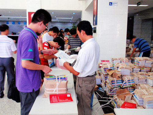 本次教材发放采取新生按个人打包、老生按班级打包模式,大大提高了发放速度和准确性。根据测算,一般情况下,一个新生在3分钟内即完成流程领到教材,而小高峰时也只需5分钟左右。绿色通道的新生直接凭学生处的绿色通道卡即可领取。(A21)