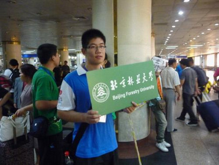 负责接站服务的20名志愿者,27号晚上就前往北京站开始了志愿服务,28号凌晨5点他们又不知疲倦,分别到北京站和北京西站最早开始志愿服务活动。志愿者们举着写有“北京林业大学”字样的牌子,在炎炎烈日下等待新生和家长的到来。志愿者们在北京站出站口一边举着牌子,一边擦额头上的汗珠,然而当看到有本校新生提着繁重的行李走过来,他们顾不上自己的疲惫,热情地微笑,兴奋地接过行李,安排新生上车休息后,继续回到出站口等待更多新生的到来。