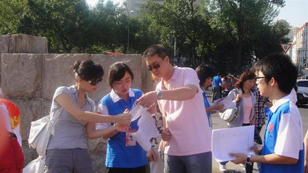 主楼平台前的咨询服务台,一名志愿者遇到了一对前来问路的母亲,这位母亲普通话讲的不是太好,虽然弄得志愿者们一头雾水,但他依然保持微笑,耐心地了解这位家长的困难,最后明白她是想问梁希实验班的详细情况,志愿者担心这位家长有可能还会因为语言沟通问题找不到具体询问地点,便主动带这位家长来到了梁希班咨询处。