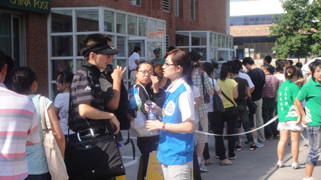 为了使新生报到有序进行,志愿者分别在财务处、校医院、图书馆等新生聚集点协助进行秩序维护。在校医院门口,面对着排着长长的报到队伍,新生志愿者在耐心地维持秩序,劝导各位家长按顺序排队,旁边桌子上的扩音器在不停地提醒着“遵守公共秩序,建设文明校园,从入学第一天做起”。