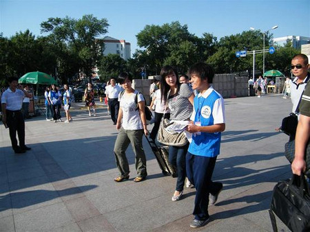 8月28日,学校正门泰山石前、北京西站、图书馆门口、公寓楼旁……我校2010级60余名新生党员(骨干)热情地为其他2010级新生帮行李、做导游、耐心解答着问题。