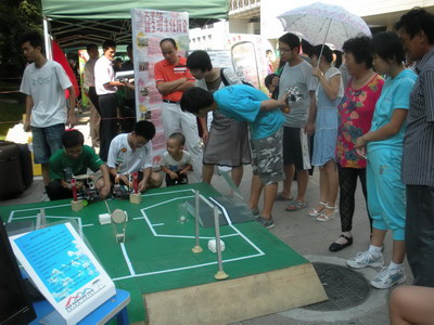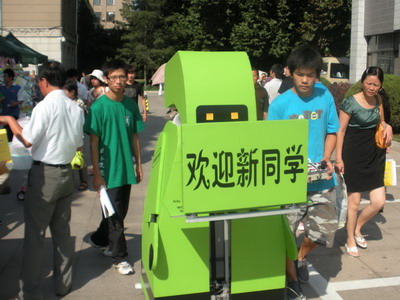 报到当天,“迎迎”一出场就吸引了不少新生和家长驻足观看,它不仅能搬运一定重量的行李,还可以将新生引导到学院服务台报到,工学院的很多新生都怀着好奇的心情跟随“迎迎”完成了报到手续。除此之外,工学院还在科技创新专题展台上演示了以“绿色长征”为主题的机器人竞赛,展示了我校机器人队参加2010年CCTV机器人大赛和2010年北京科博会的设计作品,同样吸引了众多新生和家长的关注,有些学生还亲自动手操作机器人。