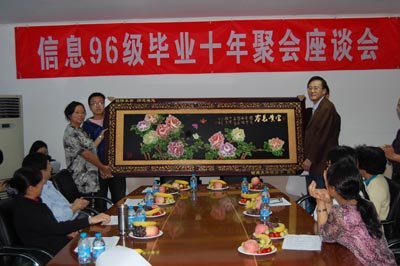 座谈会上,每位同学汇报各自的工作、生活情况,并对学院的专业设置、学科建设提出了宝贵的意见和建议。与会的信息学院相关领导和教师也畅所欲言,在接受学子们提出宝贵意见和建议的同时,也将学校和学院十年发展变化展示给他们。整个座谈会热烈而欢快。信息96级的毕业生还向母校和学院赠送了纪念礼物。