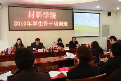 11月14日下午,材料学院团委在行政楼第九会议室举行材料学院2010年学生骨干培训班开班仪式并进行了两场主题讲座培训。开班仪式上,学院党委书记杨永福进行了开班致词,围绕学员们进入学生组织担任学生工作的目的、怎么进行学生工作、对学员们的要求这三方面进行了阐述和指导,并提出了对学员们能够本着维护学生利益的宗旨和具有刻苦精神地的去完成学生工作的希望。此外,学院团委负责老师还就培训要求进行了详细的解说,对纪律、学习心得、分组讨论等方面均提出了具体的要求。