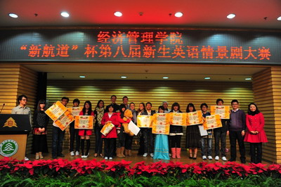 新生英语情景剧大赛从始至终都体现着“寓学于乐”的创新精神,也将班级建设与凝聚力的提升贯穿其中,充分展示了当代大学生的创造力,是极富创造性的品牌赛事。大赛还评选出“最佳男、女主角”、“最佳口语”、“最佳反串”、“最佳剧本奖”等奖项,奖励各方面表现突出的队伍和个人。(A19)