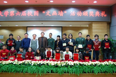 11月29日晚七点第六届校园文画墙颁奖典礼在图书馆五层报告厅举行。按照奖项设置,本次活动的最具实力奖、最佳创意奖、最具含义奖和最佳画面设计奖分别由园林08-6班、wander动漫社、艺设09-2和校学生会获得,由网络投票产生的最佳人气奖由武警国防生获得,各获奖单位学生代表发表了简短的获奖感言。