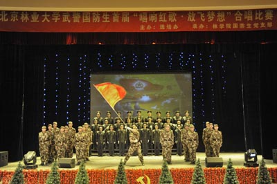 12月4日晚,国防生首届“唱响红歌,放飞梦想”合唱比赛在田家炳体育馆成功落幕。经过一番激烈的角逐,学员四队二区队获得了本次比赛的冠军,学员一队一区队及学员一队二区队分获比赛的第二和第三名,学员二队二区队获得了最佳组织奖。武警森林指挥部政治部副主任徐元鸿大校、武警部队驻北京林业大学选培办主任金文斌大校、以及来自学生处、校团委、国防生所在学院的相关负责人一起观看了此次激动人心的比赛。