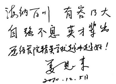 他希望同学们通过对中国传统文化的学习,了解旧中国,建设新中国;增强民族认同和自豪感;辨别传统文化的良莠,汲取精华,抛弃糟粕;把握民族文化的精神和特点,保持民族特色。讲座的最后,副校长姜恩来为经管学院精英学校亲笔题词:“海纳百川,有容乃大,自强不息,英才辈出”。(A21)