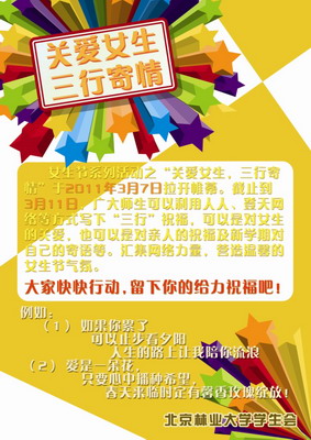 “关爱女生,三行寄情”是一个利用网络力量来开展的温馨活动。校学生会通过登天论坛、人人网等发布征集“三行诗”的帖子。同学们纷纷展示自己的才华,无论是美丽的辞藻,还是平淡的言语,都真诚地表达了对心目中那些可爱女生的美好祝愿。