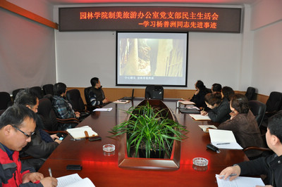 3月29日,园林学院美术旅游办公室党支部召开组织生活会,包括学院党委书记在内的12名党员参加了本次会议。全体党员共同学习了胡锦涛总书记关于广大党员干部向杨善洲同志学习的重要指示精神。