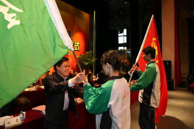 在2011年绿桥、绿色咨询启动仪式上,团中央农村青年工作部部长郭祥玉同志,国家林业局宣传办公室主任、新闻发言人程红同志,为绿色长征队伍授旗。
