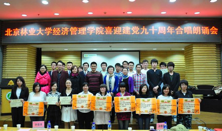 日前,经济管理学院“喜迎建党90周年”合唱朗诵会成功举办。据悉,本次合唱朗诵会,集庆祝建党九十周年系列活动中合唱比赛及朗诵比赛于一体,其主题为:吟唱一支山歌——“瞻仰建党高山,歌颂红色回廊”;讲述一个故事——“重温红色感动,铭记时代使命”。整场活动分为“开天辟地”、“青年使命”和“走向复兴”三大篇章,贯穿其中的合唱和朗诵表演,真实地讲述出中国共产党90年来所经历的风风雨雨,展现了党和国家的发展壮大。