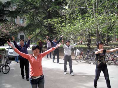每天10点10分,第八套广播体操的音乐准时在生物楼前响起。在明媚的春光下,清淡的玉兰花香中,老师们精神抖擞,欢欣鼓舞,伴着欢快有力的节奏,他们舒展筋骨,增强了体质。