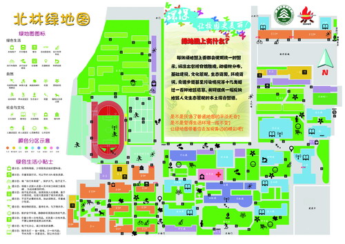 绿地图是一幅反映社区人文生态景观的本土综合图谱。它用统一的图示,标注出包括自然胜境,动植物分布,基础建设,文化景观,生态资源,环境资讯,交通步道甚至污染情况等十几类超过一百种地区信息。北林绿地图秉着“环保,让校园更美丽”的环保理念将北林校园中的绿色生活、自然、社会与特色人文囊括进一张小小的地图,在春天盛开玉兰、碧桃、榆叶梅等植物;校园中经常出现小猫、小狗及鸟类等动物;校园的青春、龙马精神等雕塑;以及校园文化墙、翱翔农庄也都标记其中。