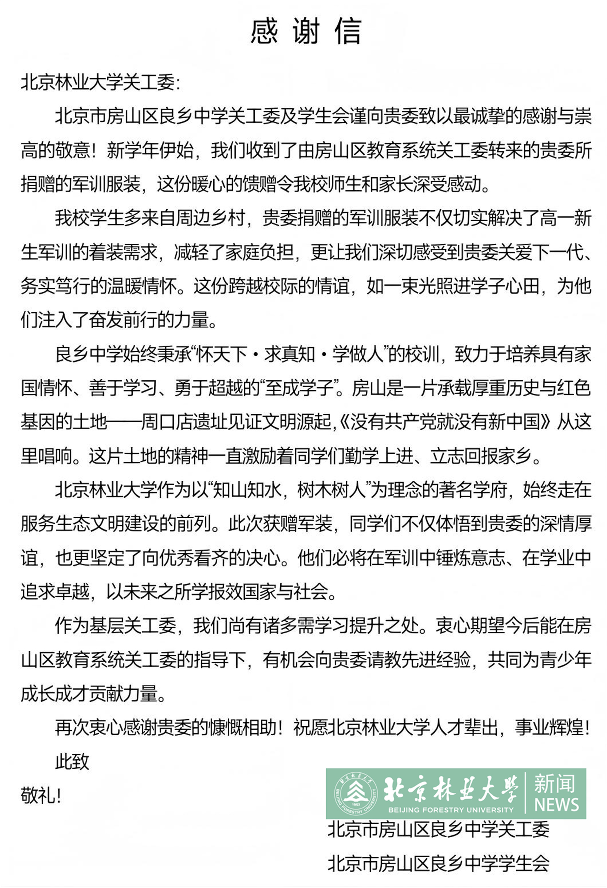 感谢信至,爱心落地生花。不久后,我校收到了一封来自接收单位的感谢信。信中写道:“我校学生多来自周边乡村,贵单位捐赠的军训服不仅切实解决了高一新生军训的着装需求,减轻了家庭负担,更让我们深切感受到贵校关爱下一代、务实笃行的温暖情怀。”一场军训服接力活动培养出跨越校际的深厚情谊,所有爱心化为温暖的种子,在远方生根发芽。