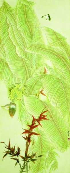 建立在“天人合一”人文思想基础上的中国画,始终将人与自然的关系放在十分突出的地位。花鸟画家们常常通过富有情感和生命的花鸟形象,巧妙地运用比、喻、兴、借等手法,结合笔墨技巧来传达自己的思想和情感。在深入领会中国花鸟画精神内核的基础上,汉平开始了自己的追求与探索。他将花鸟画创作如何在新的时代背景下“超越传统、走向现代”作为研修期间思考和实践的课题,并沿着这个方向一直走到现在。从其近期的一批新作中,我欣喜地看到了他的变化,如写意作品《早春》、《晨风拂面》、《荷塘》等,画面中流露出的阵阵新意和时代气息,充分表现出他在审美取向上的现代意识。