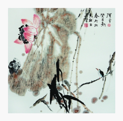 写意画《荷趣》也是我喜欢的一件作品。在这幅画中,汉平不仅用笔大胆,线条架构能撑得开,而且枯笔效果很好,整幅画有力度,看上去既大方又大气,视觉上有一种涌动感,具有灵动的笔墨表现和厚实的审美韵味。