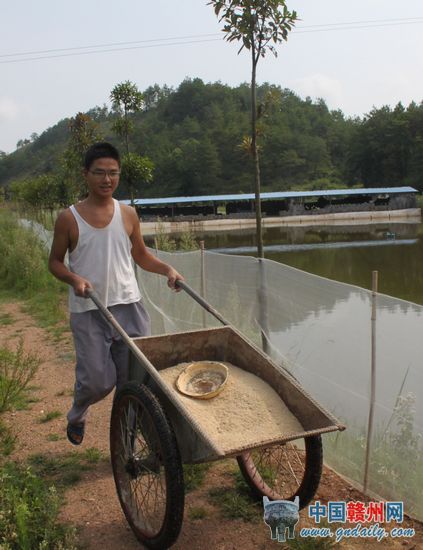 当日上午,记者慕名来到地处兴国县龙口乡丰溪村的这块养殖基地,见到了该基地的主人创业大学生陈军。刚喂完鱼料的陈军,走进临时搭建的“厂房”,与记者开始了近两个小时的对话。