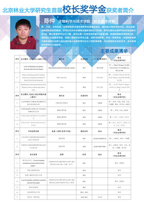 陈仲,男,25岁,中共党员,生物学院林木遗传育种专业硕博连读生,博生物 14班党支部书记,师从邬荣领教授和安新民教授,研究方向为木本植物生殖发育的分子机制。研究生期间主持研究生科技创新计划1项,累计发表学术论文17篇,其中以第一作者发表并被SCI收录3篇,获授权国家发明专利2项。曾获硕士研究生国家奖学金、第六届研究生学术之星、学术创新奖、学业一等奖学金、中国林学会林木遗传育种分会第七届全国代表大会优秀青年论文3等奖等荣誉。历任班级班长和党支书,多次获得校级优秀研究生干部称号。